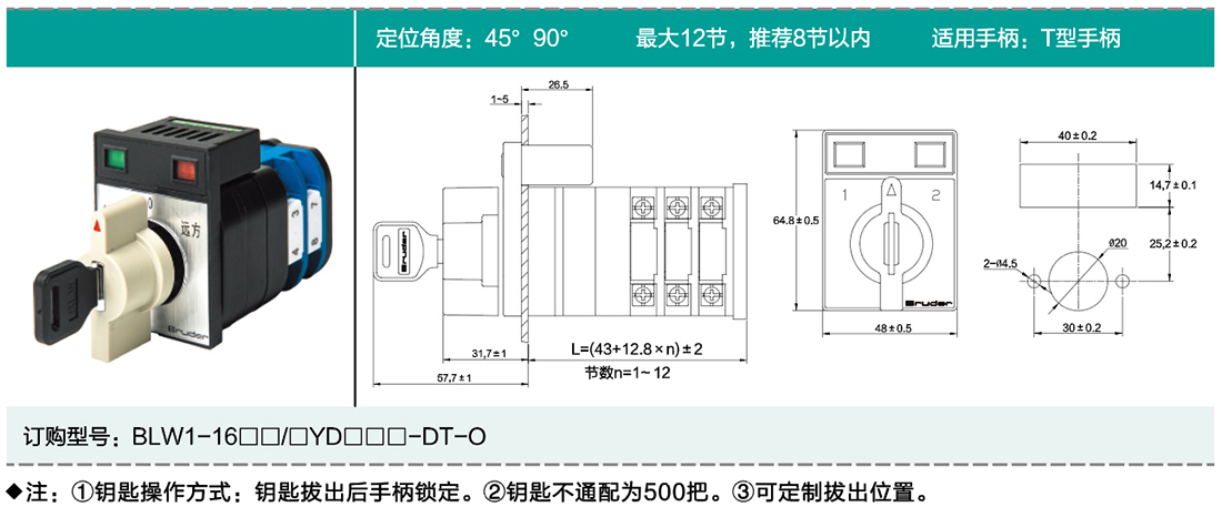 BLW1-DT series switch, suitable for AC 50-60Hz, voltage 690V and below, DC 440V and below the circuit. It can be used for the conversion of electrical control, the remote control of electrical equipment, the conversion of electrical measuring instruments, the control of servo motor and micro-motor, and the direct control of small capacity rat dragon motor.