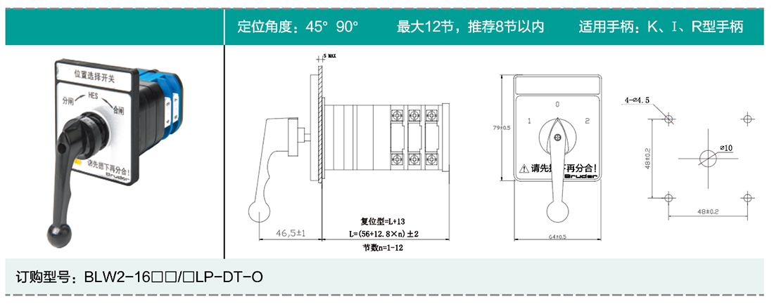 BLW series universal conversion switch is suitable for AC 50HZ~60HZ, voltage to 380V and below or DC 20V and below NC program control machine tool equipment and other electrical circuits used as medium gas control conversion and distribution equipment remote control, electrical measuring instrument conversion and servo motor, micro motor control. Can also be used for small capacity squirrel cage asynchronous motor control, at present, our company has 1, 2, 3, 4 series 10A, 16A, 20A and 63A four specifications to choose from, fully consider the requirements of users in all walks of life.